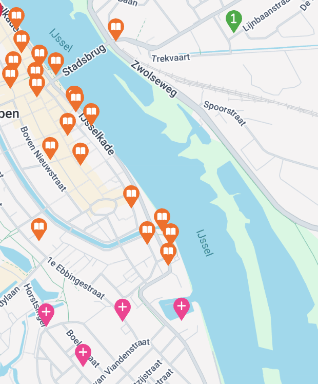 De oranje locaties zijn de locaties uit de Stadswandeling (zonder opdrachten), de groene locaties zijn de locaties in het buitengebied en de roze locaties zijn de locaties die niet in de Stadswandeling meegenomen zijn, maar die wel heel interessant zijn. De struikelstenen zijn te herkennen aan de gele locaties.