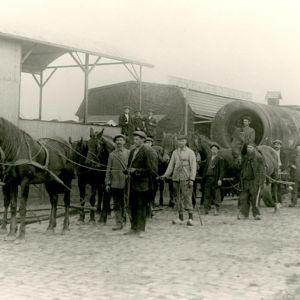De stoom-zuivelfabriek had natuurlijk wel eens een nieuwe stoomketel nodig. In 1923 was de ketel blijkbaar aan vervanging toe, want de foto uit dat jaar geeft een beeld van het transport van een stoomketel naar de melkfabriek in ’s Heerenbroek. Deze ketel werd per spoor van Hengelo naar Kampen vervoerd. Vanuit Kampen was het nog een hele klus om het zware object naar de eindbestemming te krijgen. Speciaal voor de laatste etappe richting de fabriek was een onderstelwagen gemaakt van oude kanonfuiten. Op de foto staan acht paarden voor de wagen gespannen. Vanwege het zware gewicht, de onderstelwagen schijnt gedeeltelijk in de asfaltweg te zijn weggezakt, werden later aan de Zwolseweg nog eens acht paarden voor de wagen gespannen.